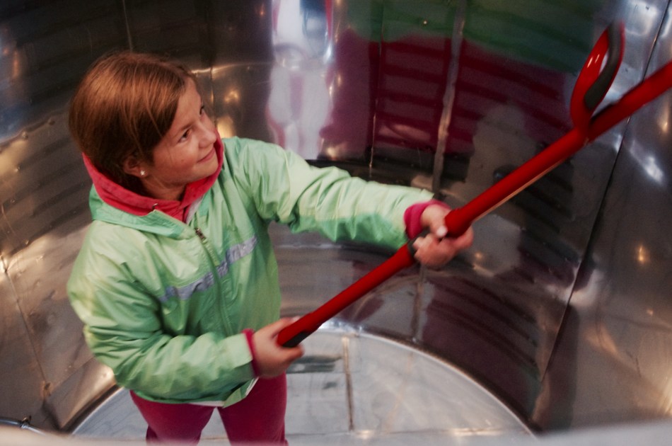 Cleanliness is divine. It’s a major part of winemaking and on harvest day we were grateful to have our daughter’s help. Adult joints and muscles stiff from hard work make crawling through a narrow man-door a greater chore with each passing year. When you are ten years old, it’s a game!