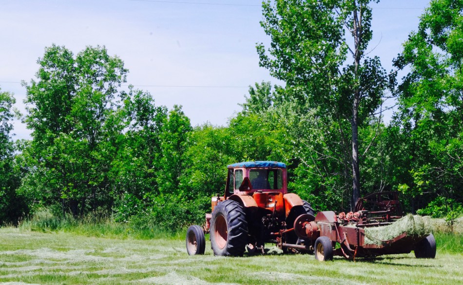 Our neighbour keeps the land tidy, counts the bales he takes from our land, and deducts a fee from the bill he sends us for keeping our lane clear in the winter. I love the old farm equipment he uses. When I was a kid I used to ride behind equipment like this on a hay wagon at my grandfather’s farm. The bales would come out as fast as my cousins and I could stack them. Great memories of green smells, warm sunshine and itchy eyes.