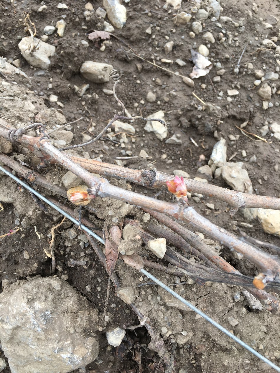 I scouted the vineyard on one of the rare dry days last week. Despite the cooler weather, many of the vines showed progress, especially where they were uncovered. Young buds on the Cab Franc are pink, the colour of cotton candy, which shows up in stark contrast against the grey, stoney soil. Budbreak!