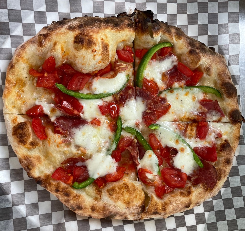 The first couple of days of service were a steep learning curve, but we soon became proficient at managing our pizza oven. Nephew Jon learned remarkably quickly and became a fantastic pizzaiolo. If you’ve ever had neapolitan style pizza, you know it’s all about getting the perfect crust.  Jon baked the perfect golden crust with tiny leopard spots every time.